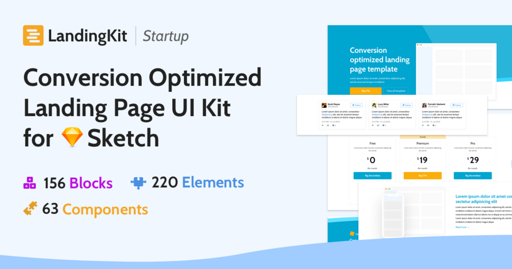 Easily create landing page designs with this conversion optimized UI Kit for Sketch.